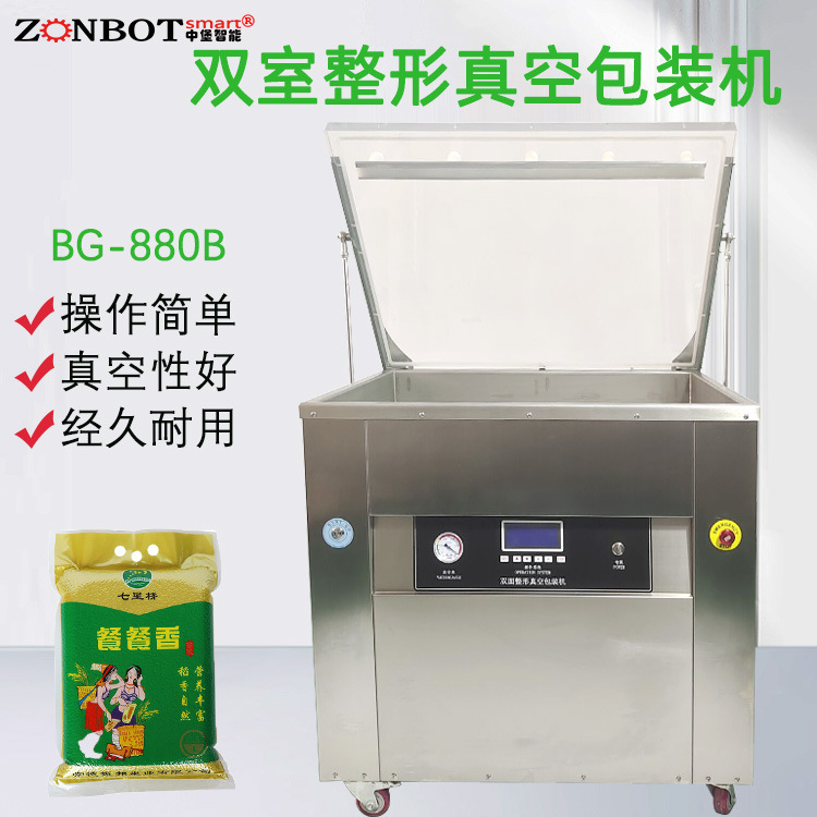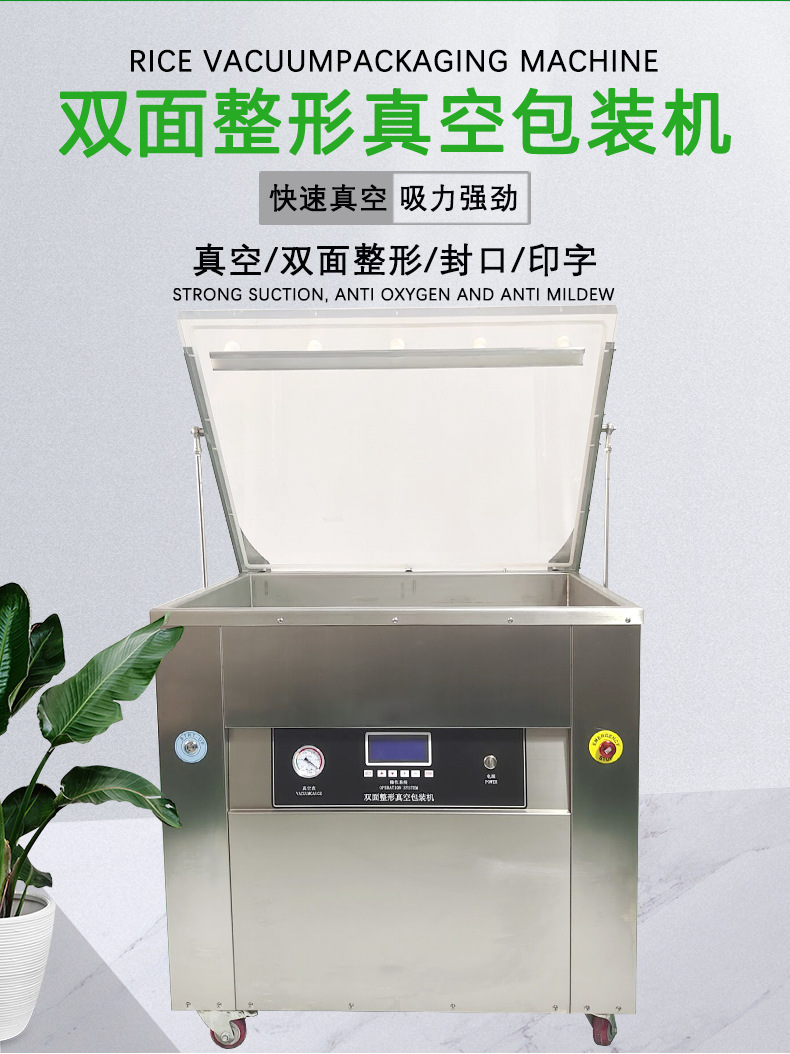 功能特點(diǎn) 整形功能 大米整形真空包裝機(jī)具備獨(dú)特的整形模塊。在包裝過程中,這個模塊可以對大米進(jìn)行整理,使大米在包裝袋內(nèi)排列更加整齊、緊密。通過物理擠壓或者特定的振動方式,讓大米顆粒之間的間隙減小,呈現(xiàn)出規(guī)則的形狀,從而提升包裝的美觀度。 例如,對于一些高端大米品牌,經(jīng)過整形后的大米在包裝袋內(nèi)形狀規(guī)整,給消費(fèi)者一種高品質(zhì)的視覺感受,有助于提升產(chǎn)品的檔次。 真空包裝功能 真空系統(tǒng)是該包裝機(jī)的核心部分之一。它通過真空泵抽取包裝袋內(nèi)的空氣,使袋內(nèi)形成真空環(huán)境。通常情況下,能夠達(dá)到較高的真空度,一般在 -90kPa